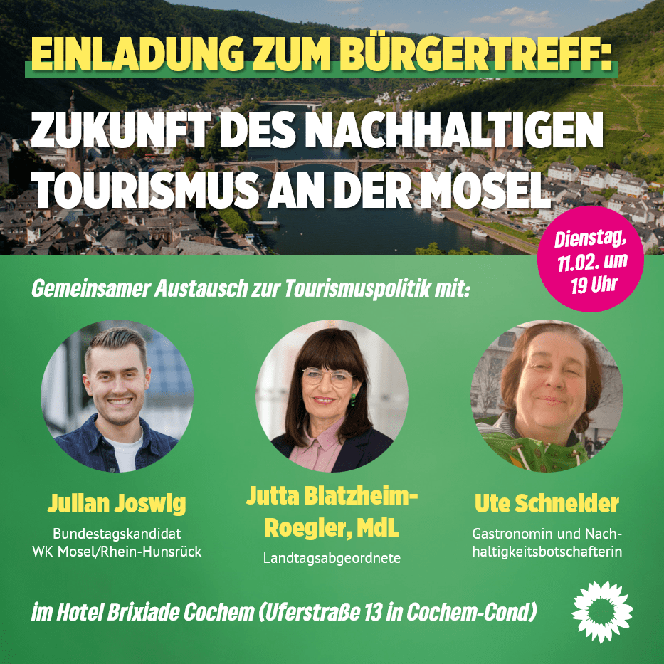 Der Tourismus ist ein wichtiger Wirtschaftsfaktor für die Mosel, viele Menschen aus Nah und Fern verbringen ihren Urlaub in der Region. Wie wird der Tourismus vor Ort zukünftig aussehen, kann dieser umwelt- und naturverträglicher gestaltet werden? Darüber diskutieren beim offenen Bürgertreff der GRÜNEN Cochem-Zell: Der offene Bürgertreff zur Tourismuspolitik findet am Dienstag, 11. Februar um„Austausch zur Tourismuspolitik am 11. Februar in Cochem“ weiterlesen