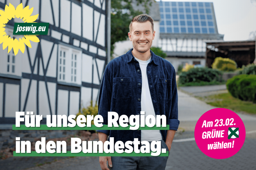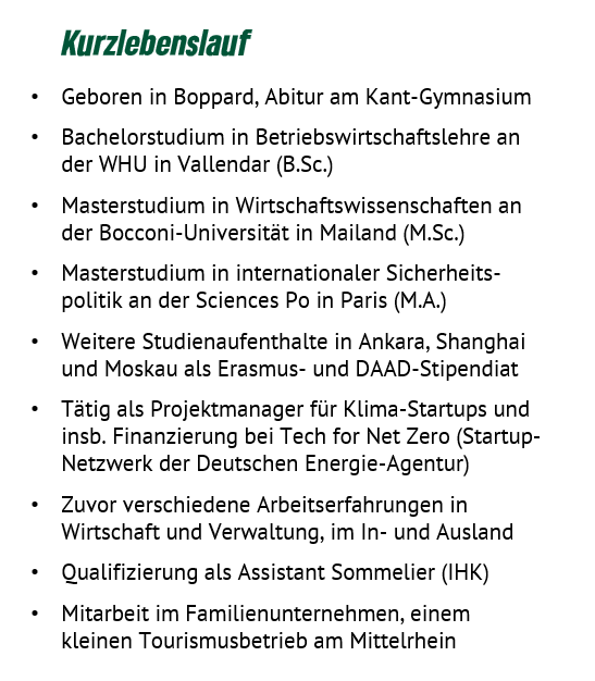 Als Direktkandidat von BÜNDNIS 90/DIE GRÜNEN im Wahlkreis 199 Mosel/Rhein-Hunsrück sowie als Kandidat auf dem aussichtsreichen Platz 4 der rheinland-pfälzischen Landesliste trete ich an, um mich im nächsten Bundestag für eine zukunftsorientierte Politik und die Interessen der Menschen aus Rheinland-Pfalz einzusetzen.