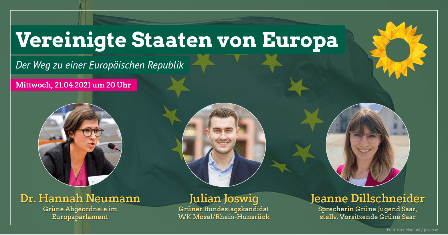 Online-Diskussion am Mittwoch, 21.04.2021 um 20 Uhr Viele der aktuellen Herausforderungen – vom Klimawandel bis zur Verteidigung der liberalen Demokratie – lassen sich nicht national lösen, sondern benötigen internationale Antworten. Wir brauchen eine Politik, die über den Tellerrand hinaus schaut und Demokratie konsequent europäisch denkt. In unserem Programmentwurf zur Bundestagswahl schreiben wir Grüne: “Unser Fixstern„Vereinigte Staaten von Europa – Der Weg zu einer Europäischen Republik“ weiterlesen