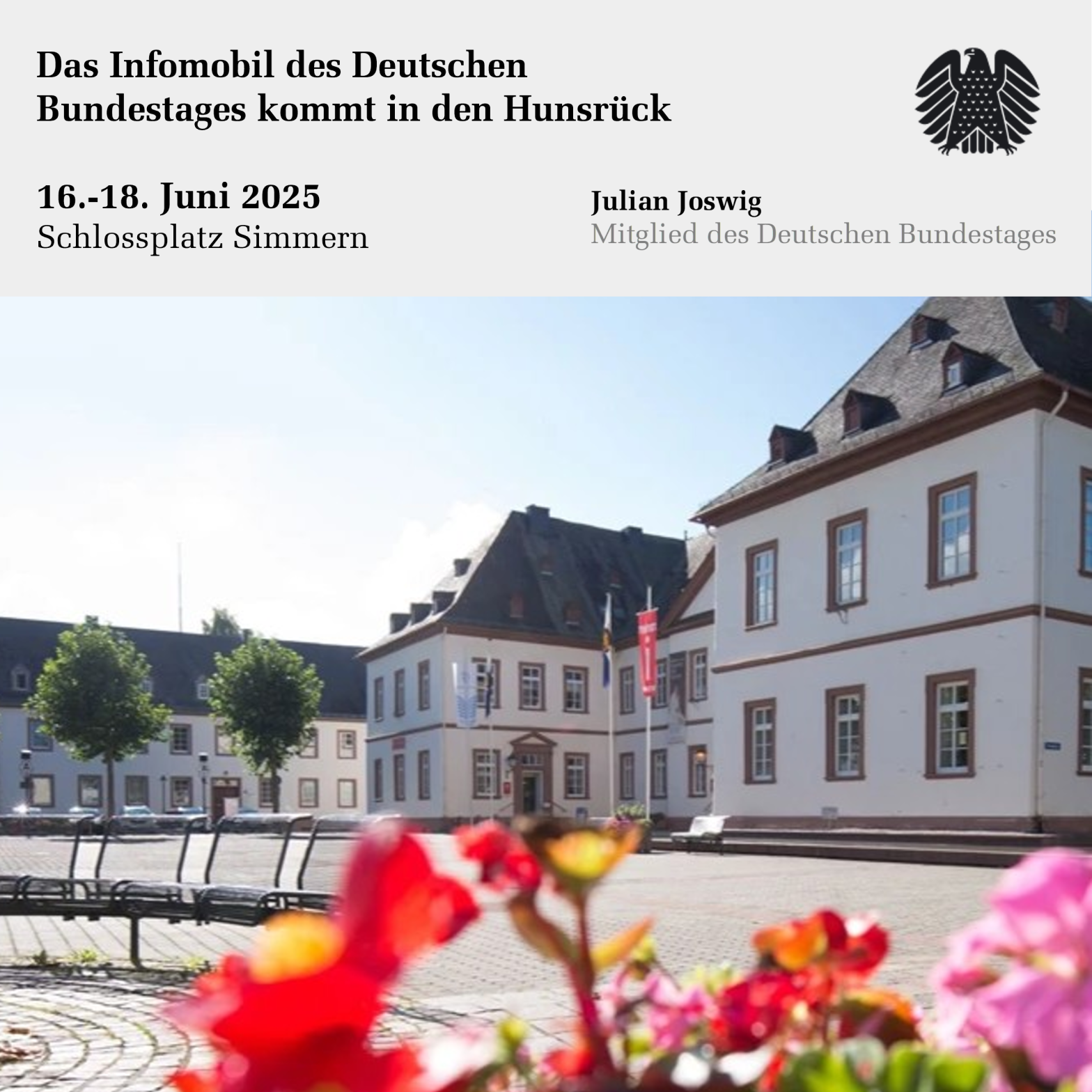 Pressemitteilung anlässlich des Besuchs der Infomobils in Simmern Vom 16. bis 18. Juni 2025 macht das Infomobil des Deutschen Bundestages Station auf dem Schlossplatz in Simmern, der Kreisstadt des Rhein-Hunsrück-Kreises – ein echtes Highlight für alle politisch Interessierten in der Region. Alle Bürgerinnen und Bürger haben an drei Tagen die Gelegenheit, ganz unmittelbar Einblicke in„Das Infomobil des Deutschen Bundestages kommt in den Hunsrück“ weiterlesen